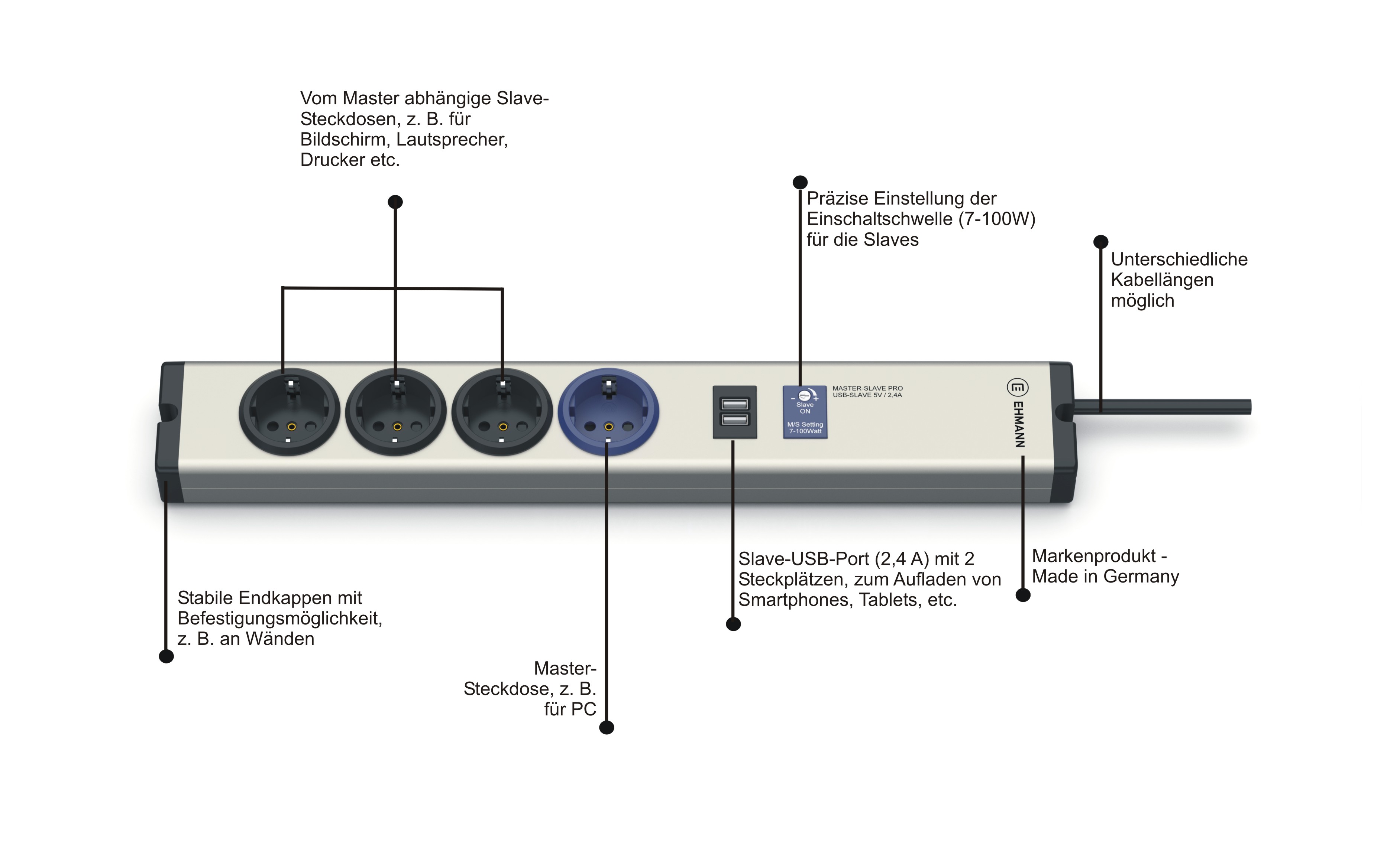 Produktinformationen "Aluminium Master-Slave PRO Steckdosenleiste 4-fach + USB-A"