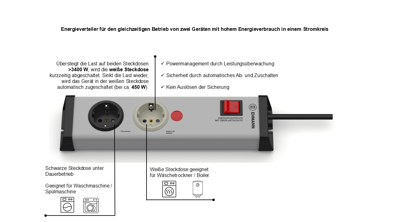 - Die maximale Leistung (siehe Steckdosenleiste) darf nicht überschritten werden.