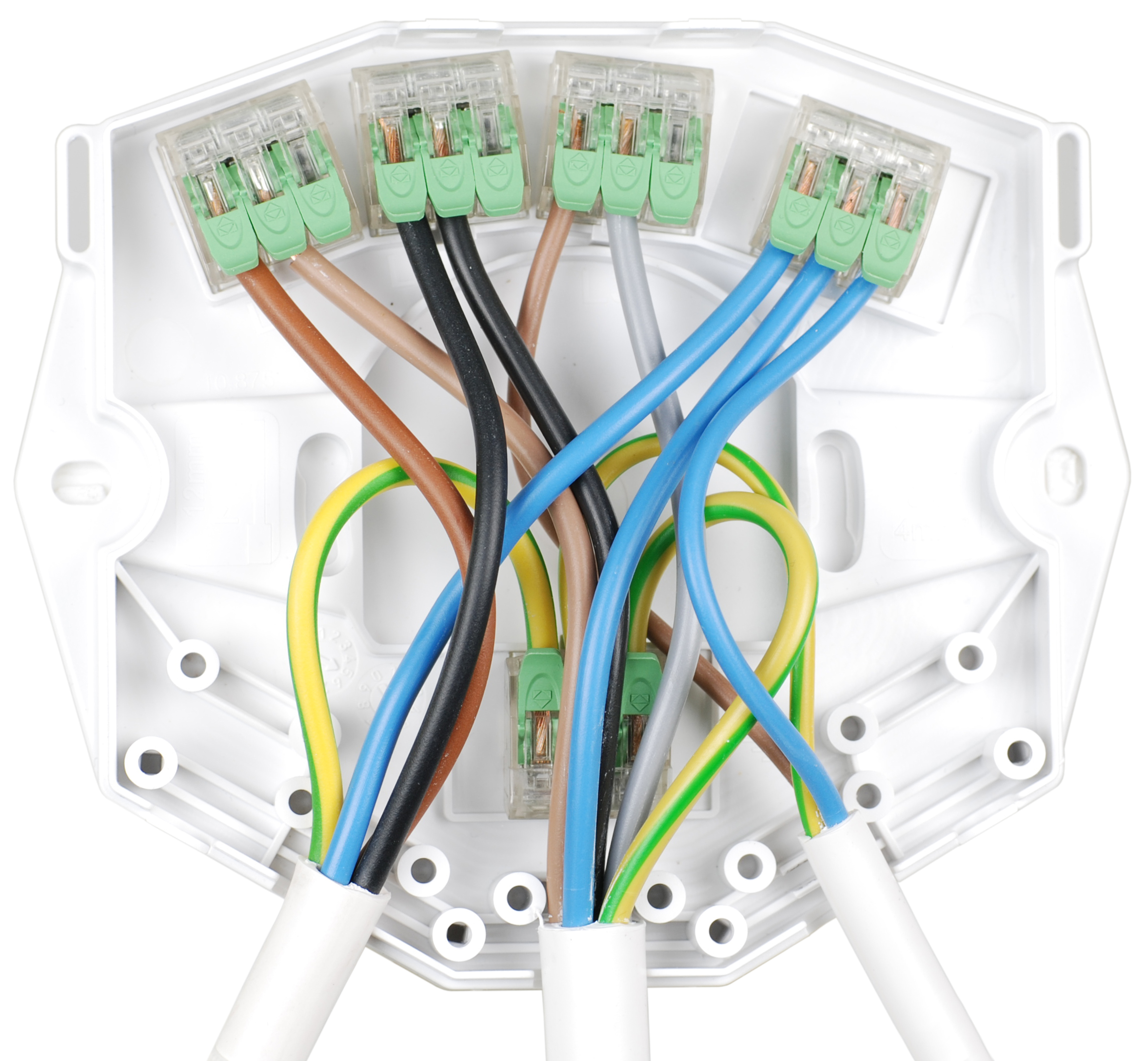 VDE zertifizierte Hebelklemmen, fixiert im Gehäuse – für den Anschluss mehrerer Geräte
