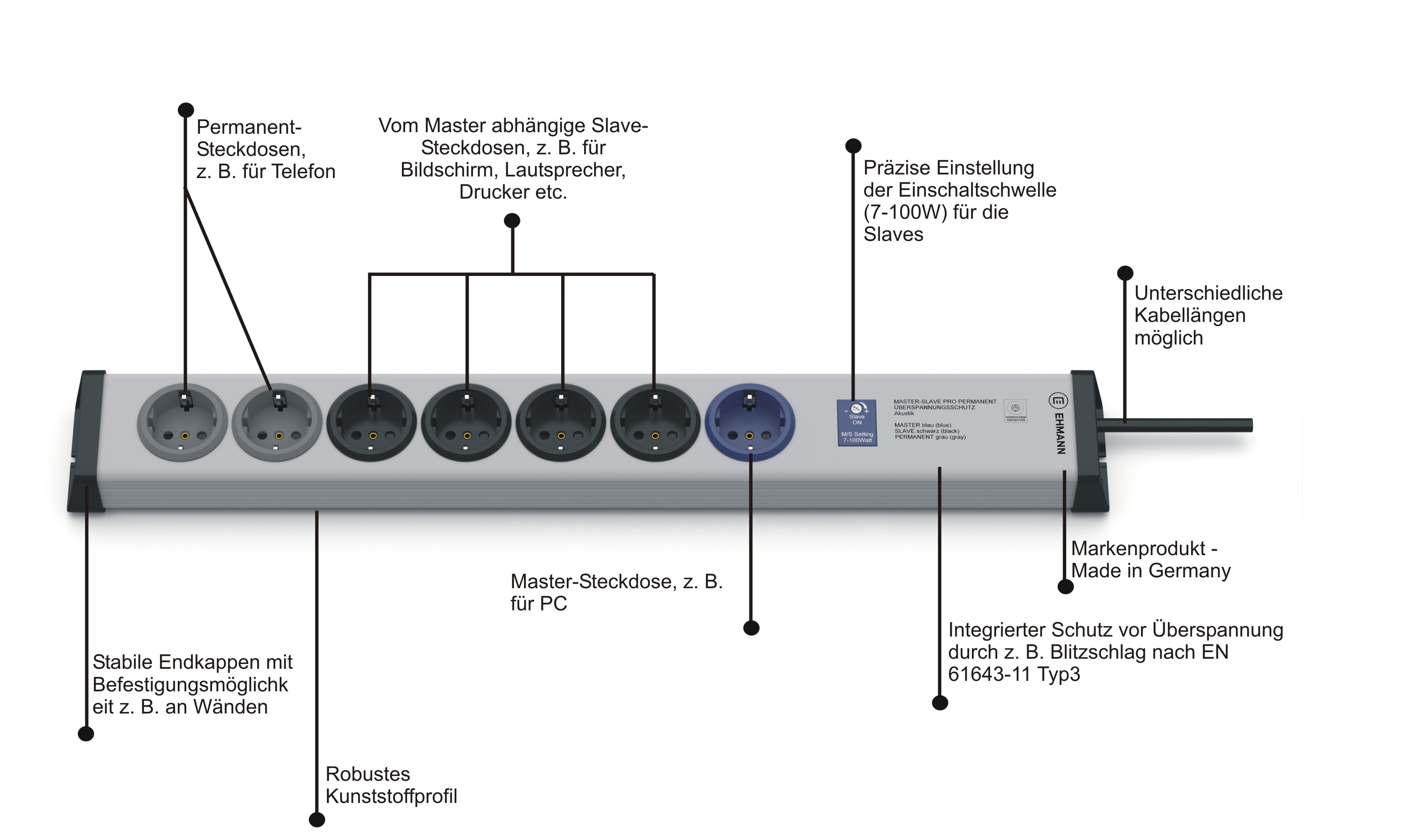 Produktinformationen "Master-Slave PRO Steckdosenleiste 5+2-fach mit Überspannungsschutz"
