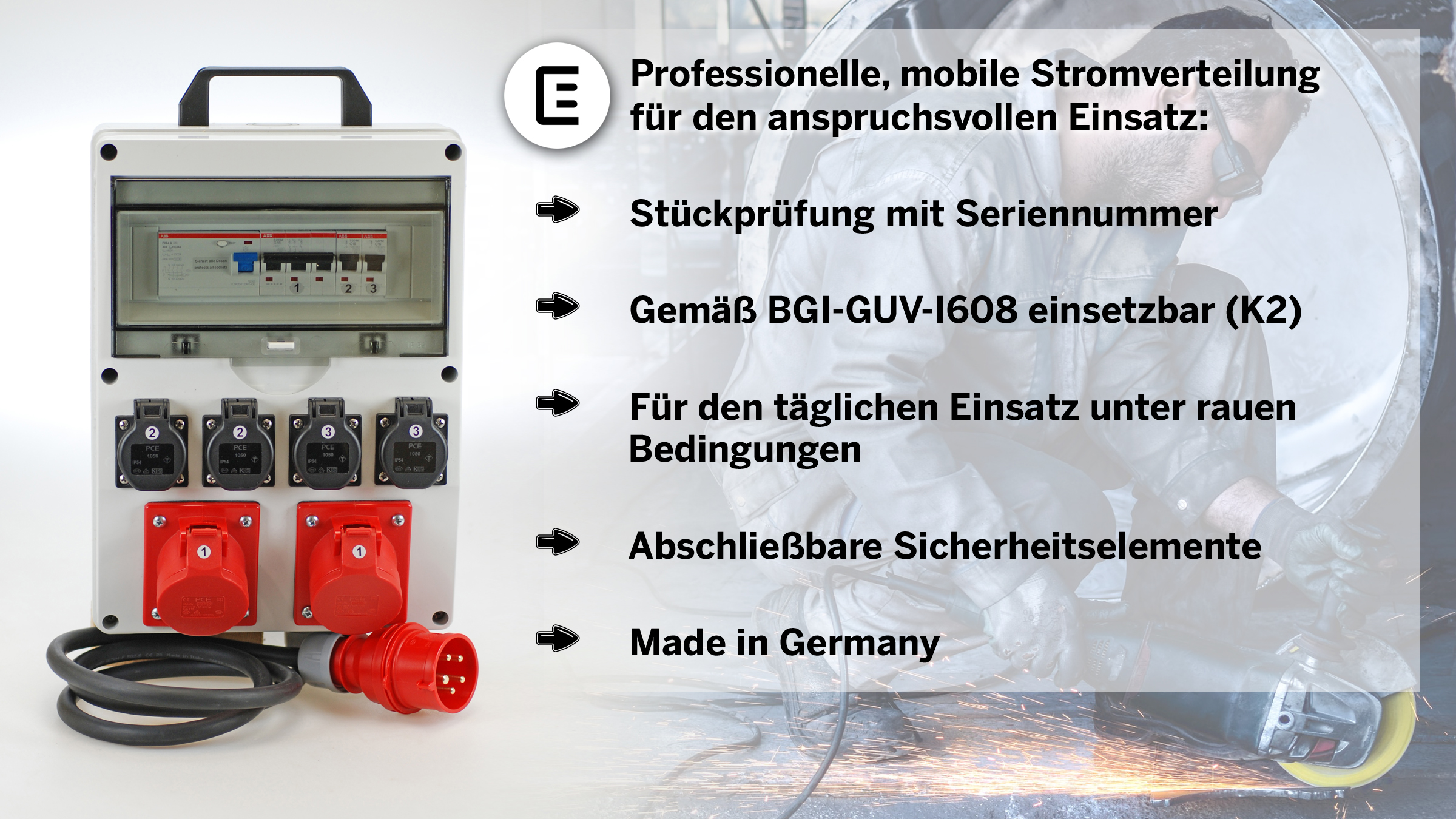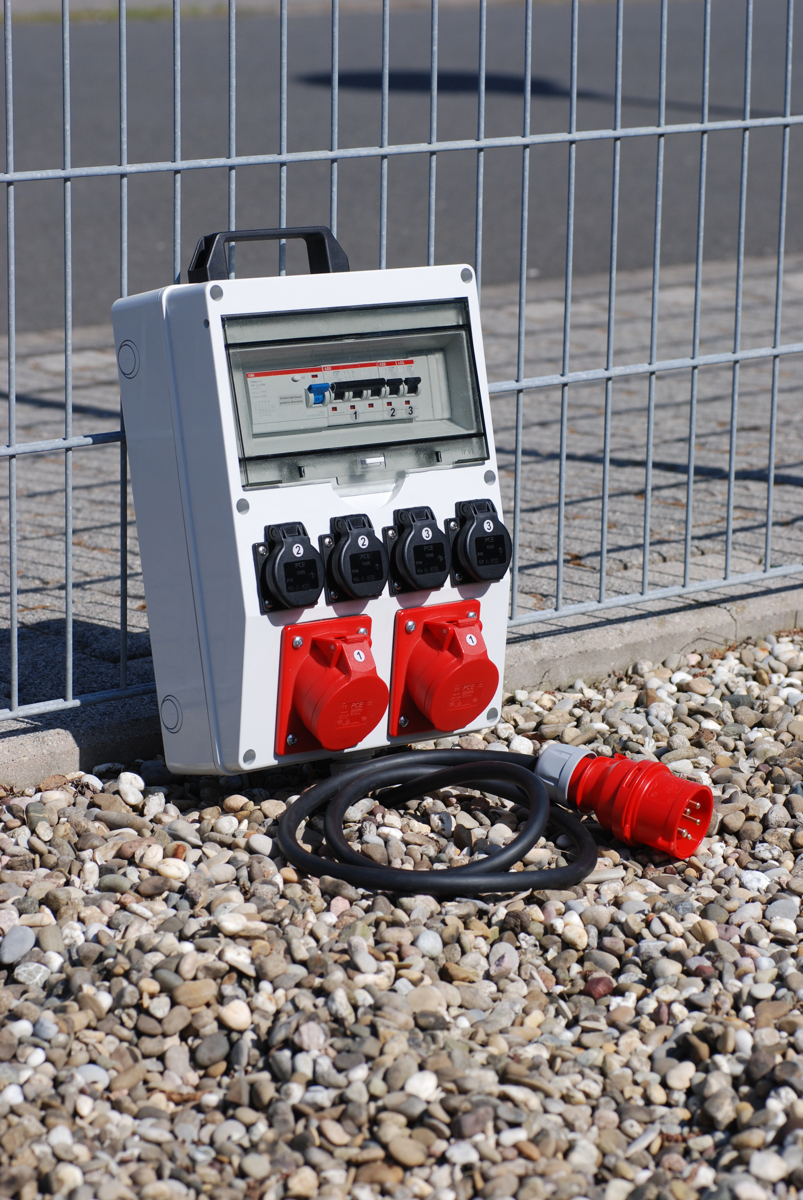 Produktinformationen "Mobiler Kunststoff-Verteiler 2x CEE 16A + 4x Steckdosen mit Absicherung und Tragegriff "