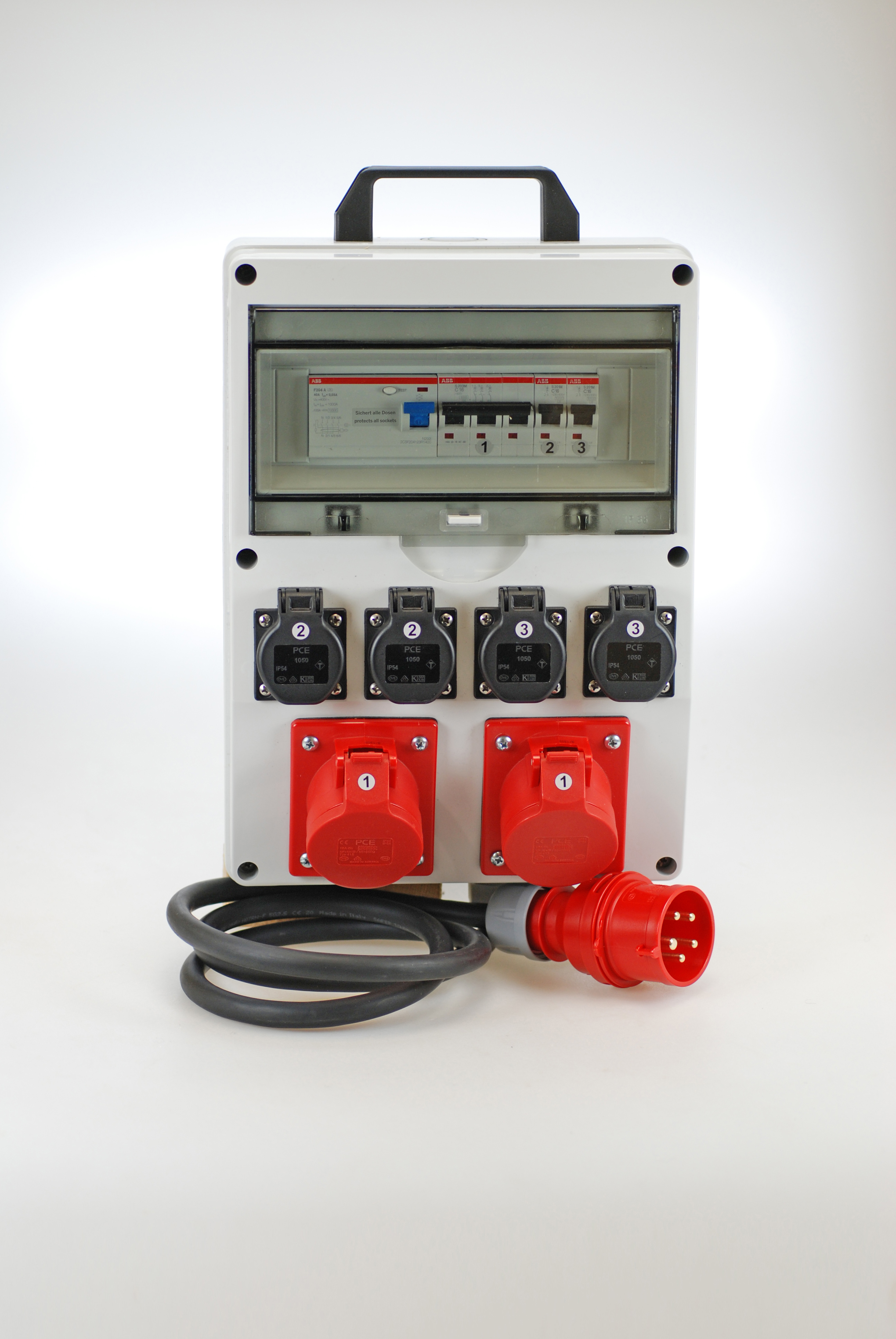 Mobiler Kunststoff-Verteiler 2x CEE 16A + 4x Steckdosen mit Absicherung und Tragegriff