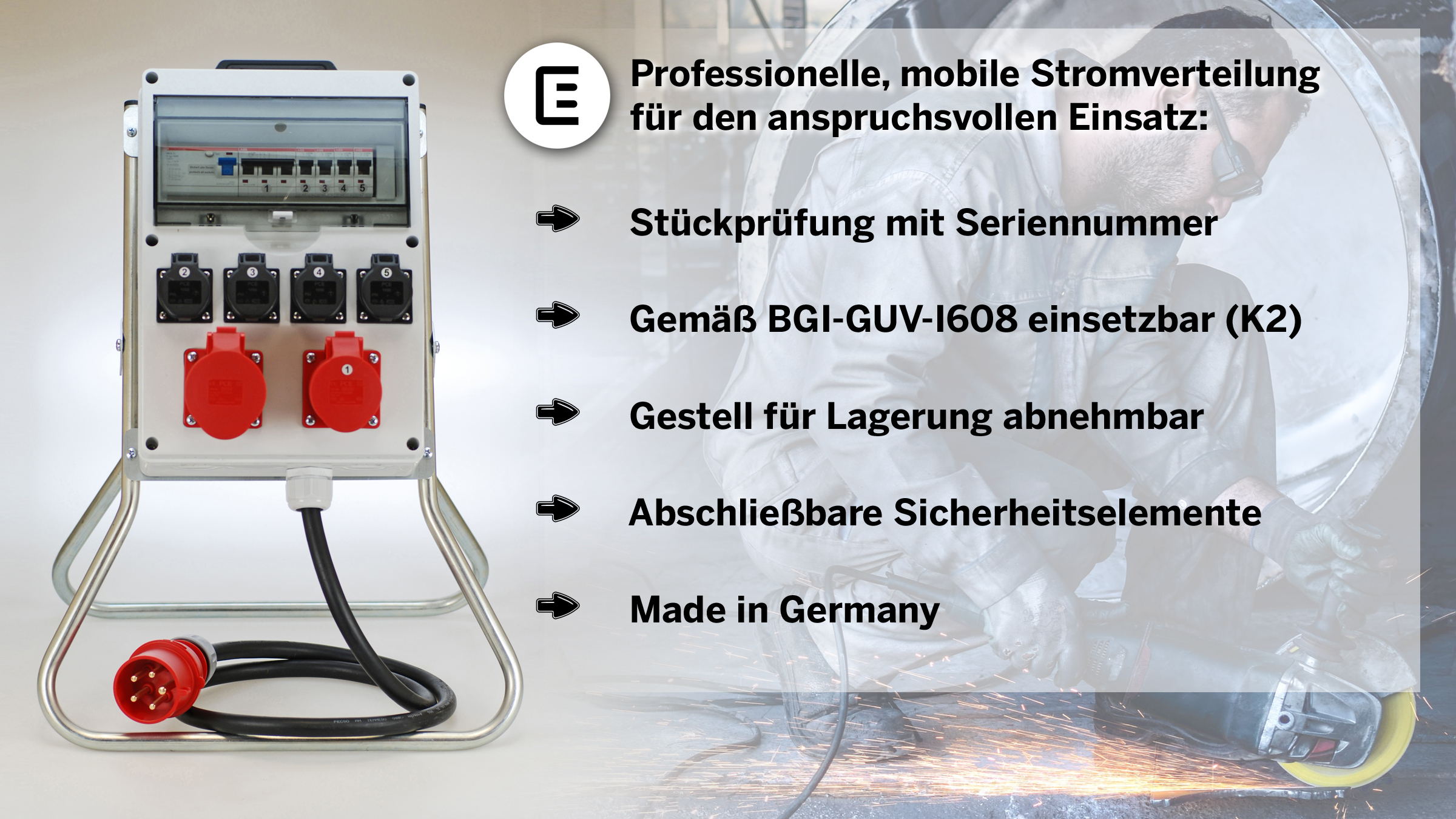 - EHMANN VORTEIL Das Gehäuse ist aus robustem, witterungsbeständigem und schlagfestem ABS-Kunststoff. BGI-GUV-I608 konform. Der Verteiler ist für den täglichen harten Einsatz auf Baustellen ausgelegt und tausendfach bewährt. Gestell schützt vor Wasser und Schmutz.