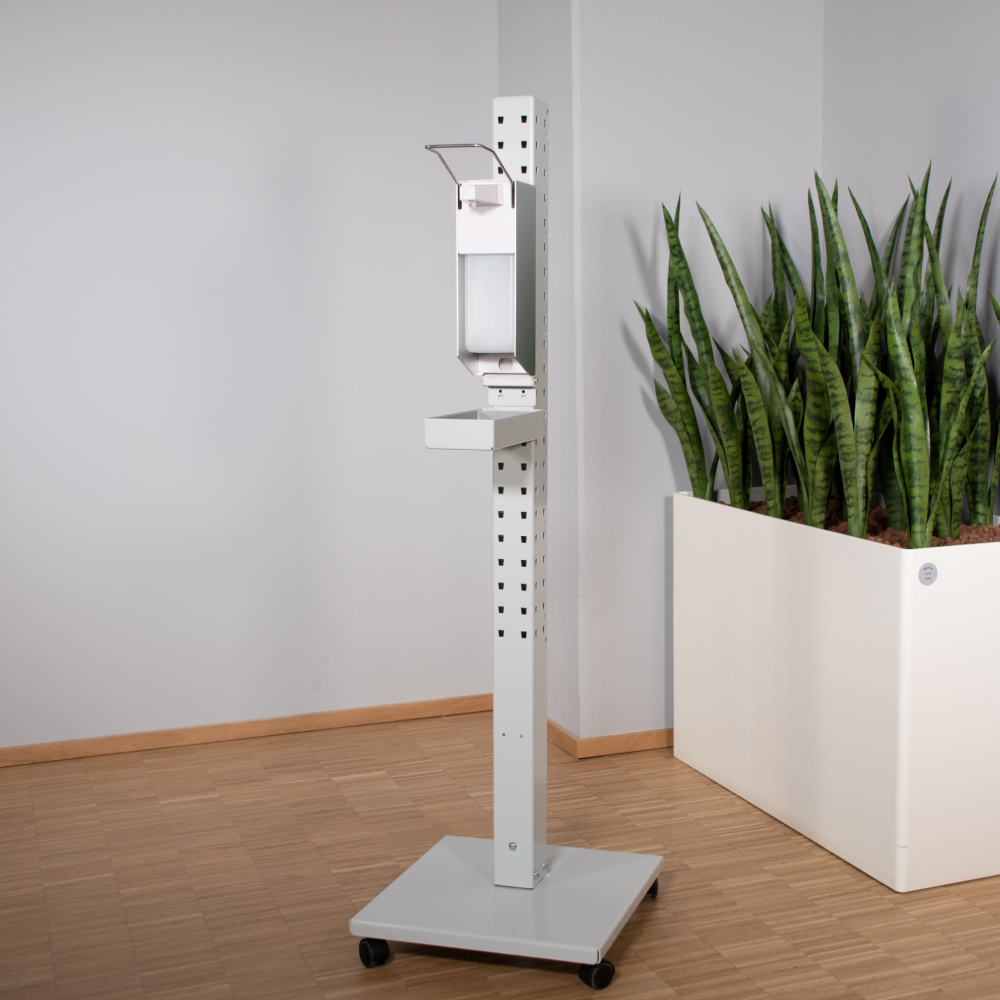 - Lieferumfang: Hygienesäule mit flacher Bodenplatte (inkl. 4 Rollen und 4 Filzgleitern),Befestigungsplatte für Hygienespender, Desinfektionsmittelspender mit Armbedienhebel, 1.000 ml Leerflasche zur Selbstbefüllung, Abtropfschale, Halterung für Hygienetuchbox, Halterung für Flaschen, zweiteilig verstellbar Mülleimer